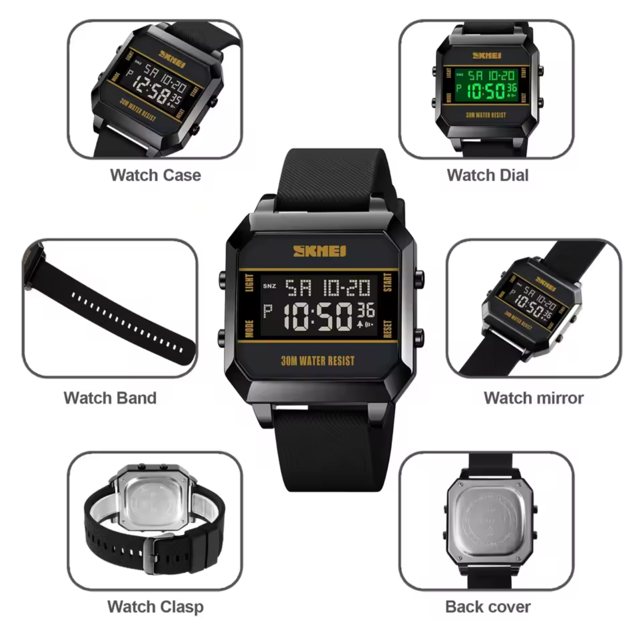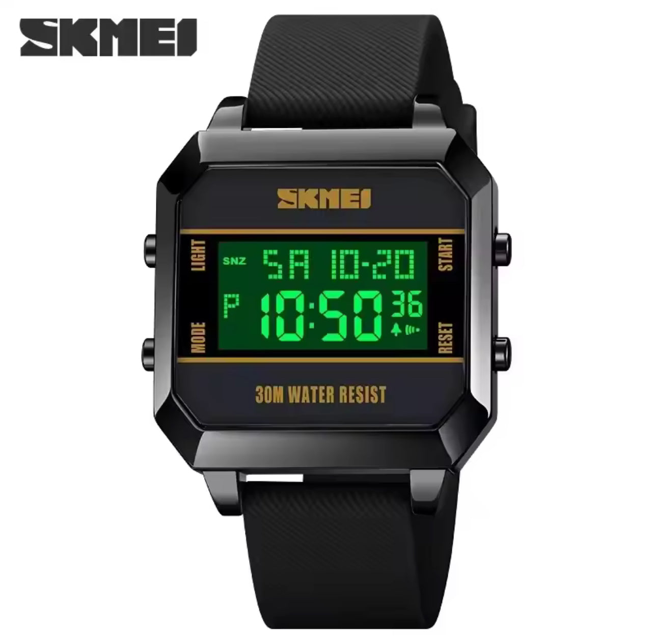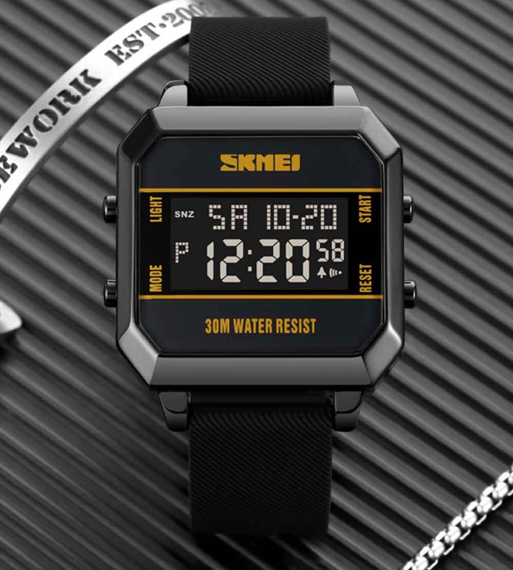 Enhance your style with the SKMEI STYLISH FUNKY 1848 digital watch. Its waterproof, steel case and celicone strip offer durability while the date day feature and Ip-black colour add convenience and versatility. Perfect for students seeking a stylish and functional timepiece.