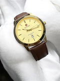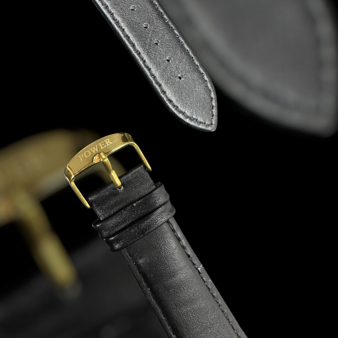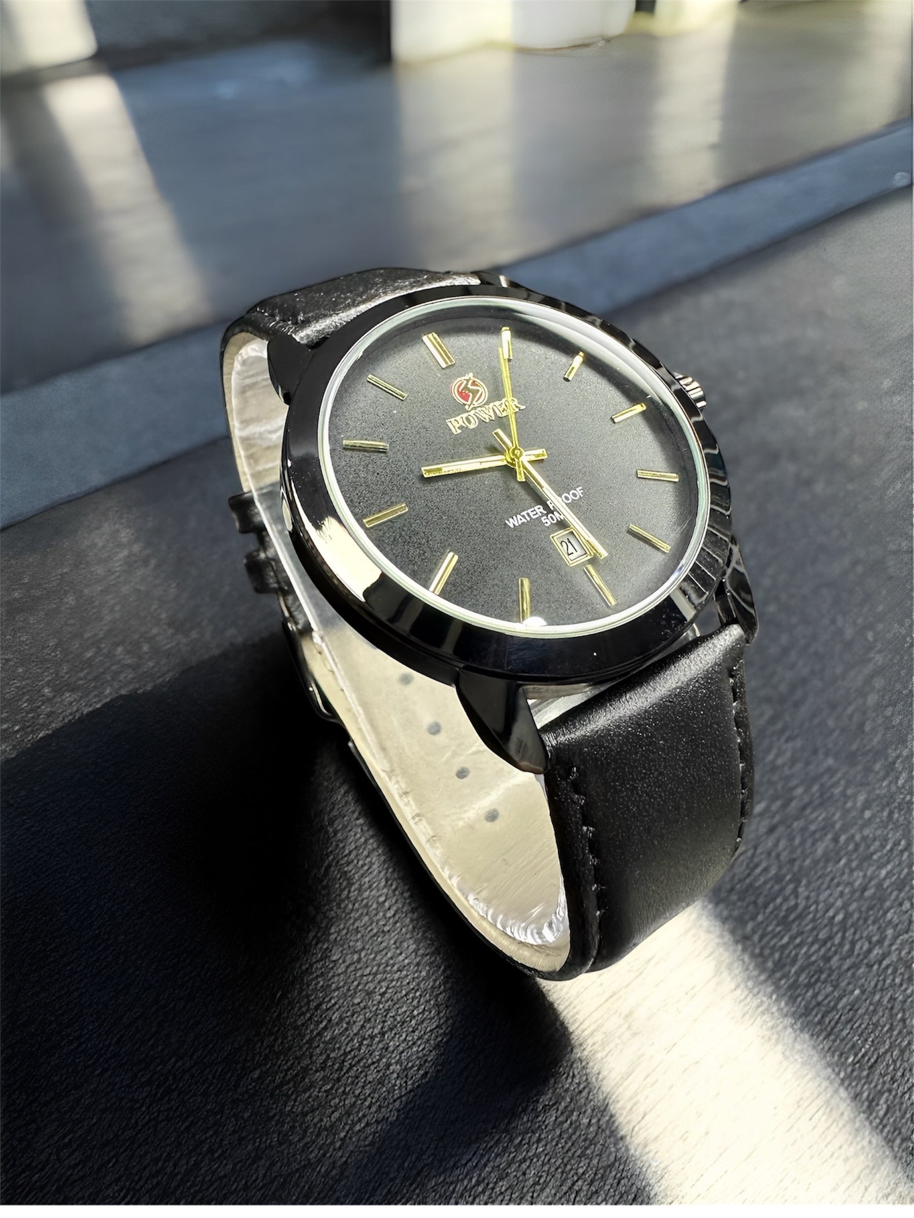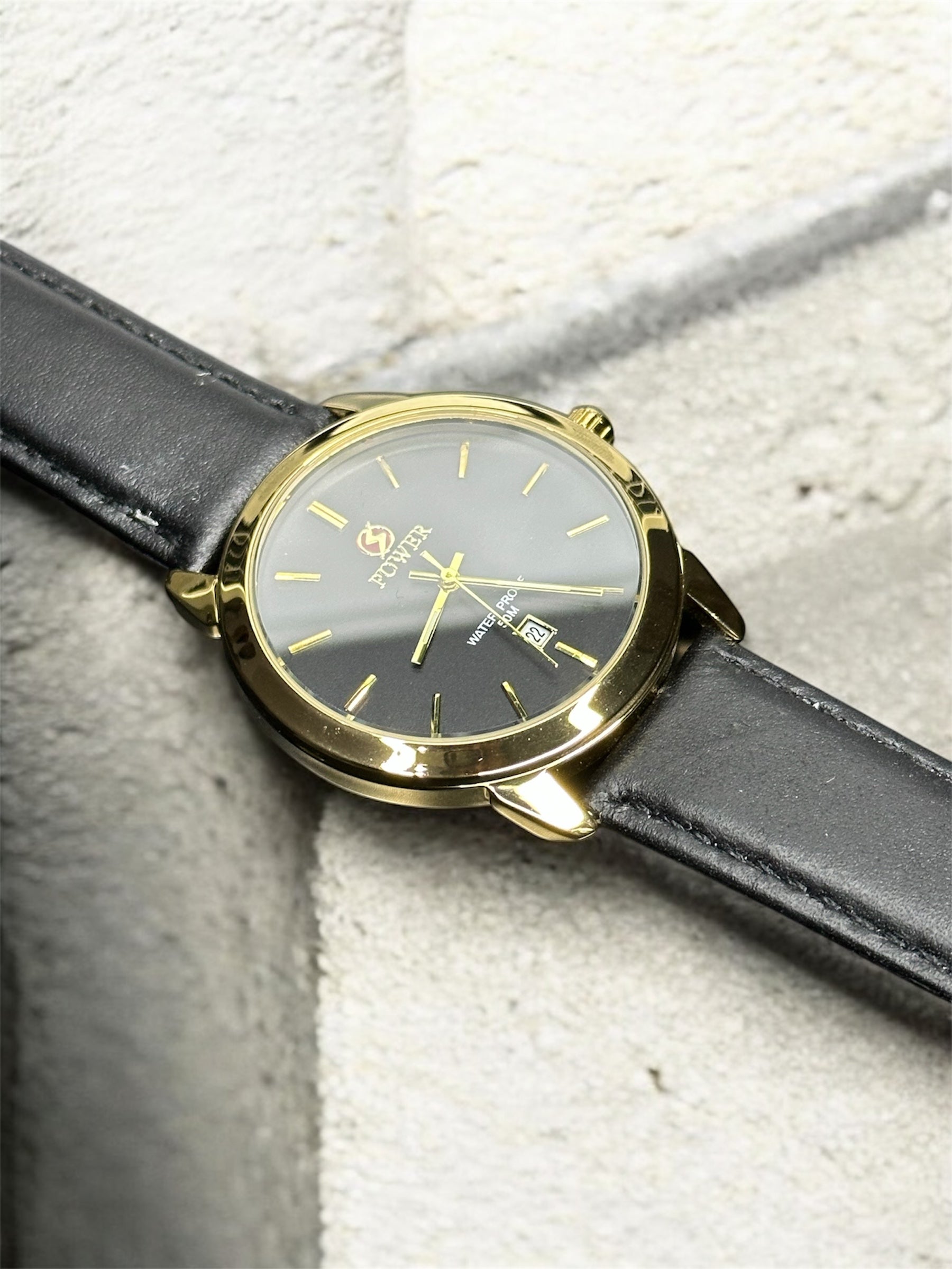 POWER slim thin Lather Strip Watch for men stainless steel case with date calender