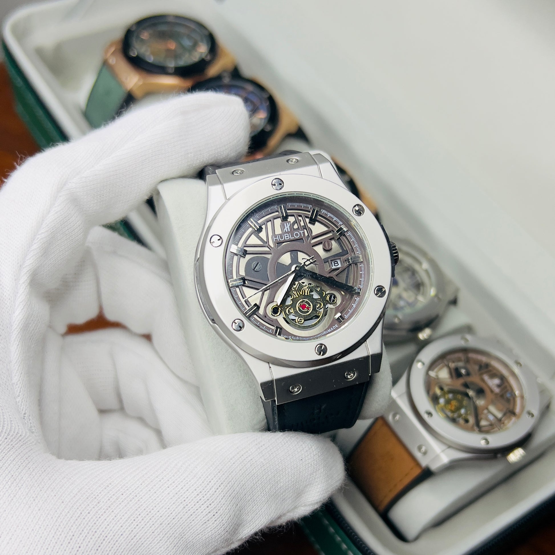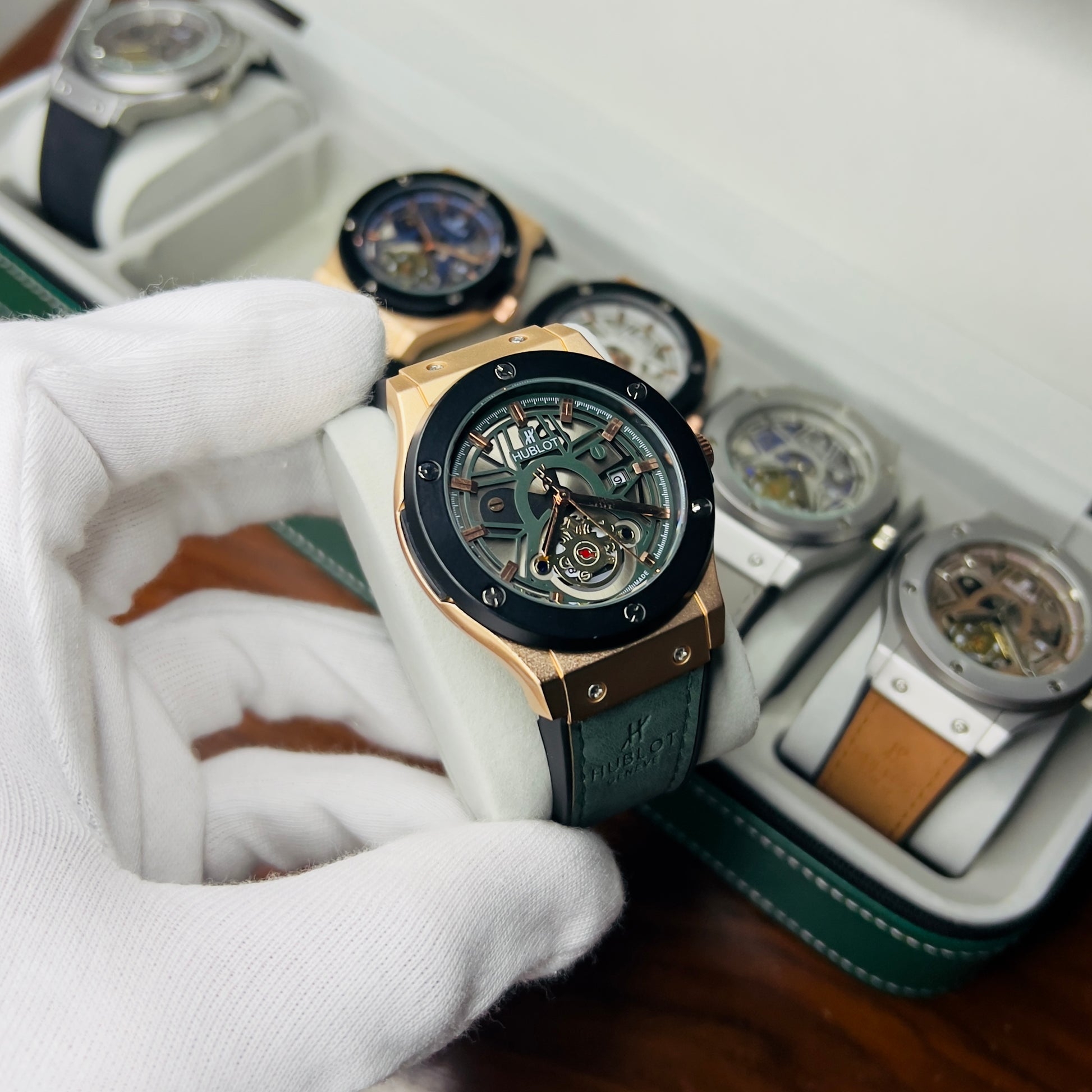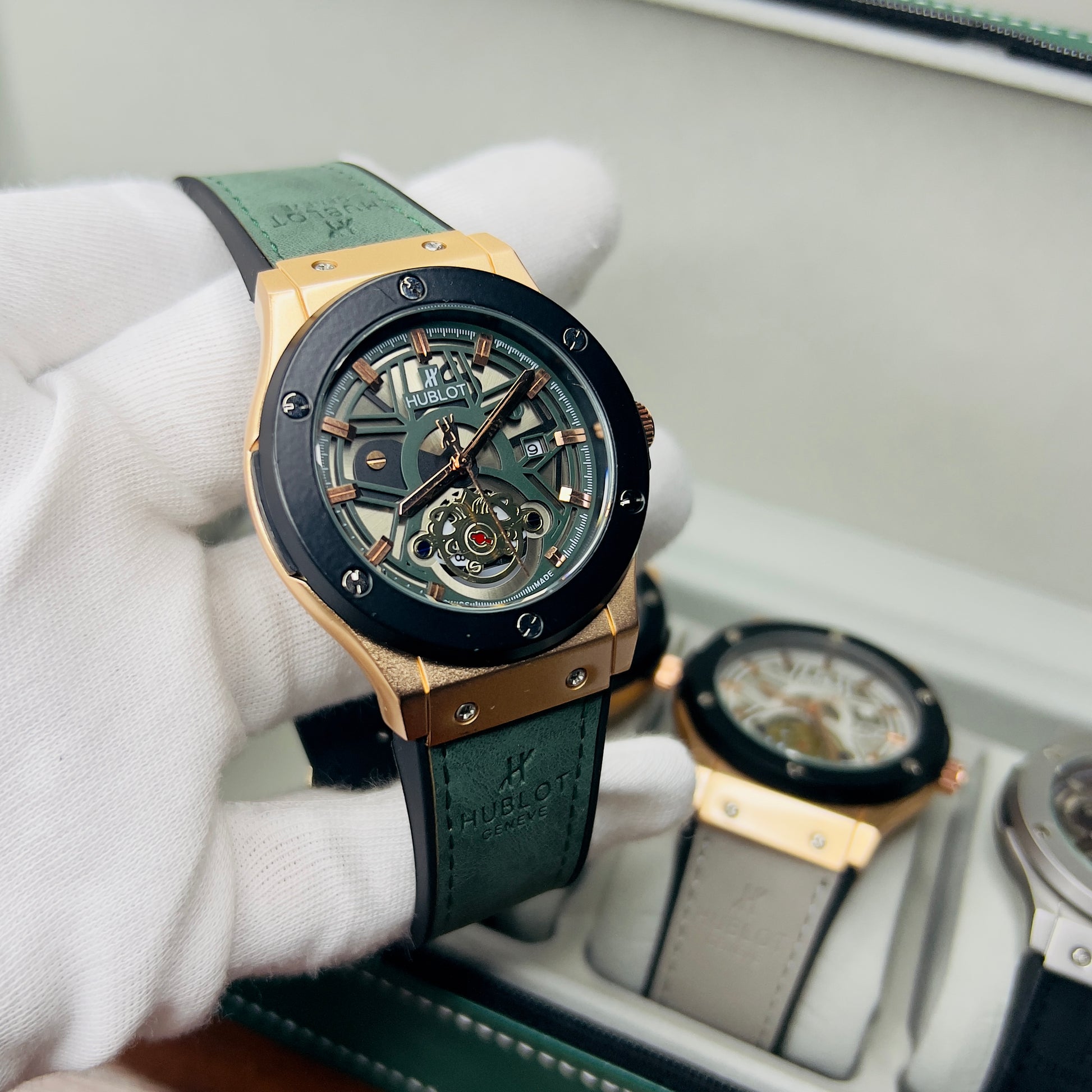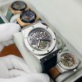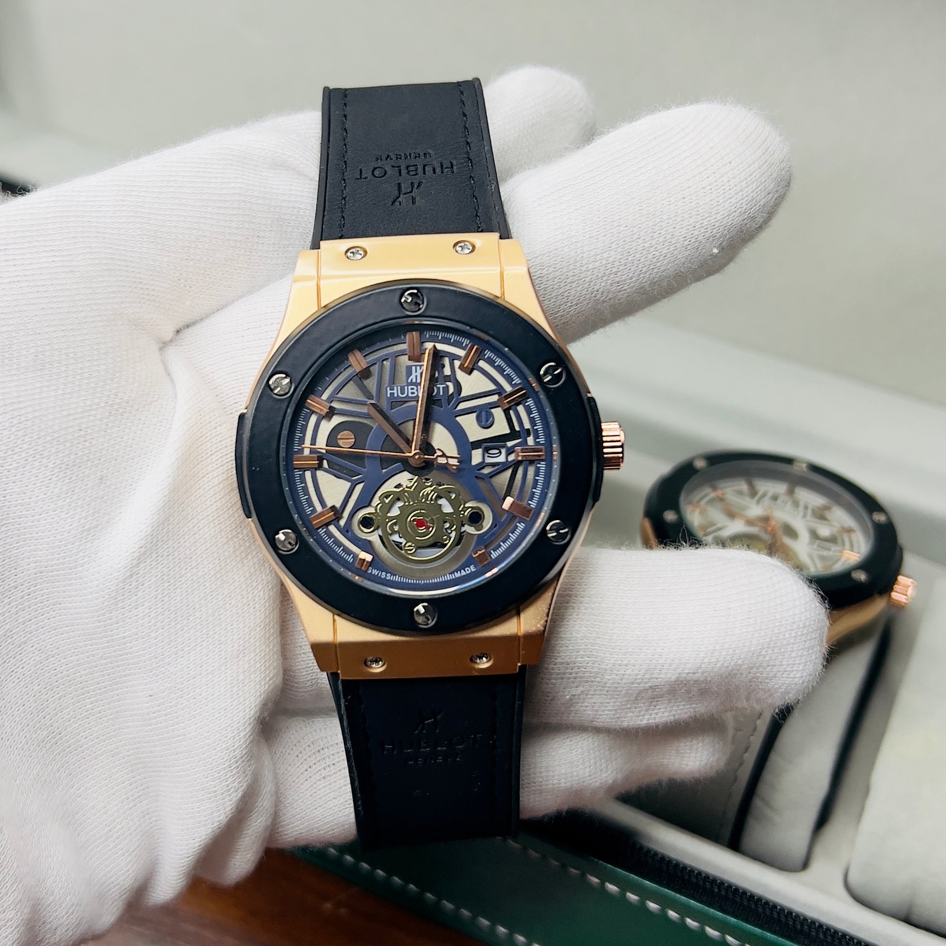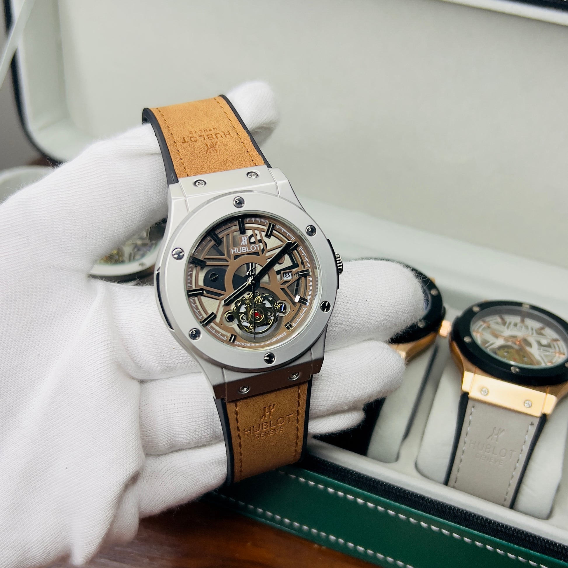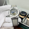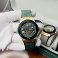 Expertly crafted for precision and durability, the HUBLOT GENEVA boasts a date function and water-resistant design. The lather_urbber strip and steel lock provide comfort and security, while the steel case comes in a variety of stylish colors. Choose from green, brown, silver, or classic black to complement your unique style.