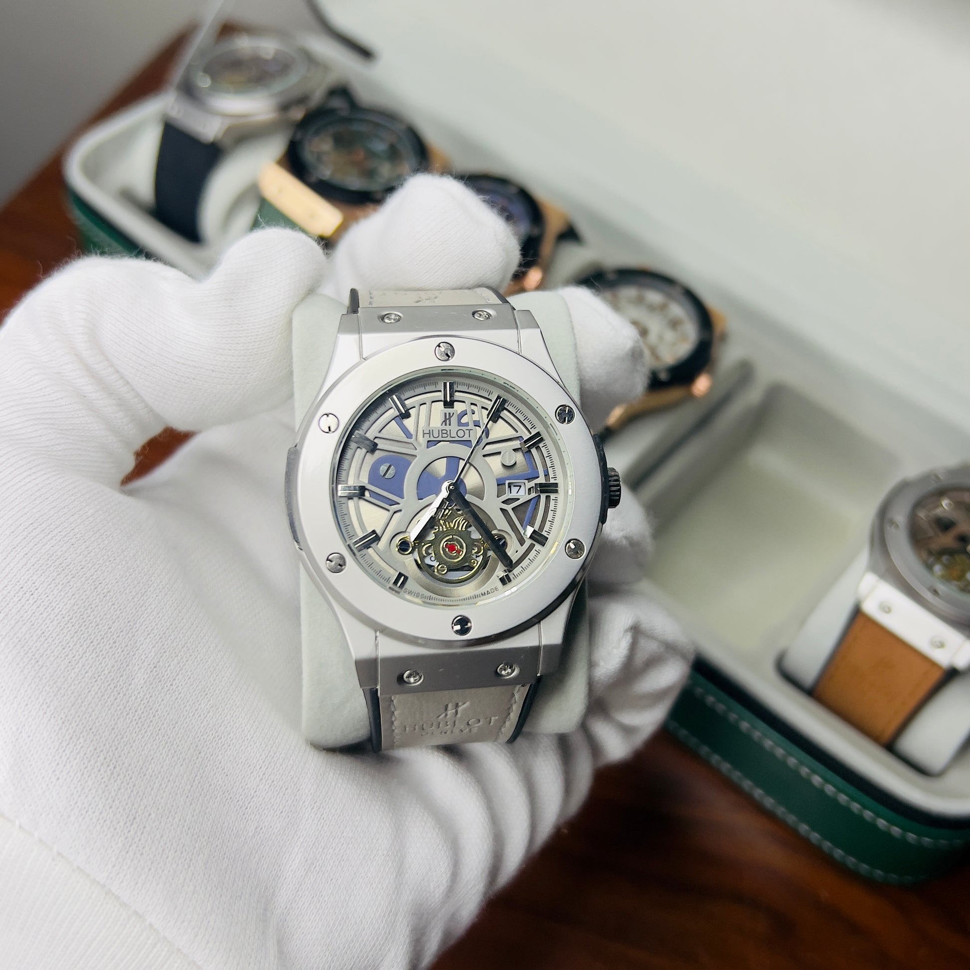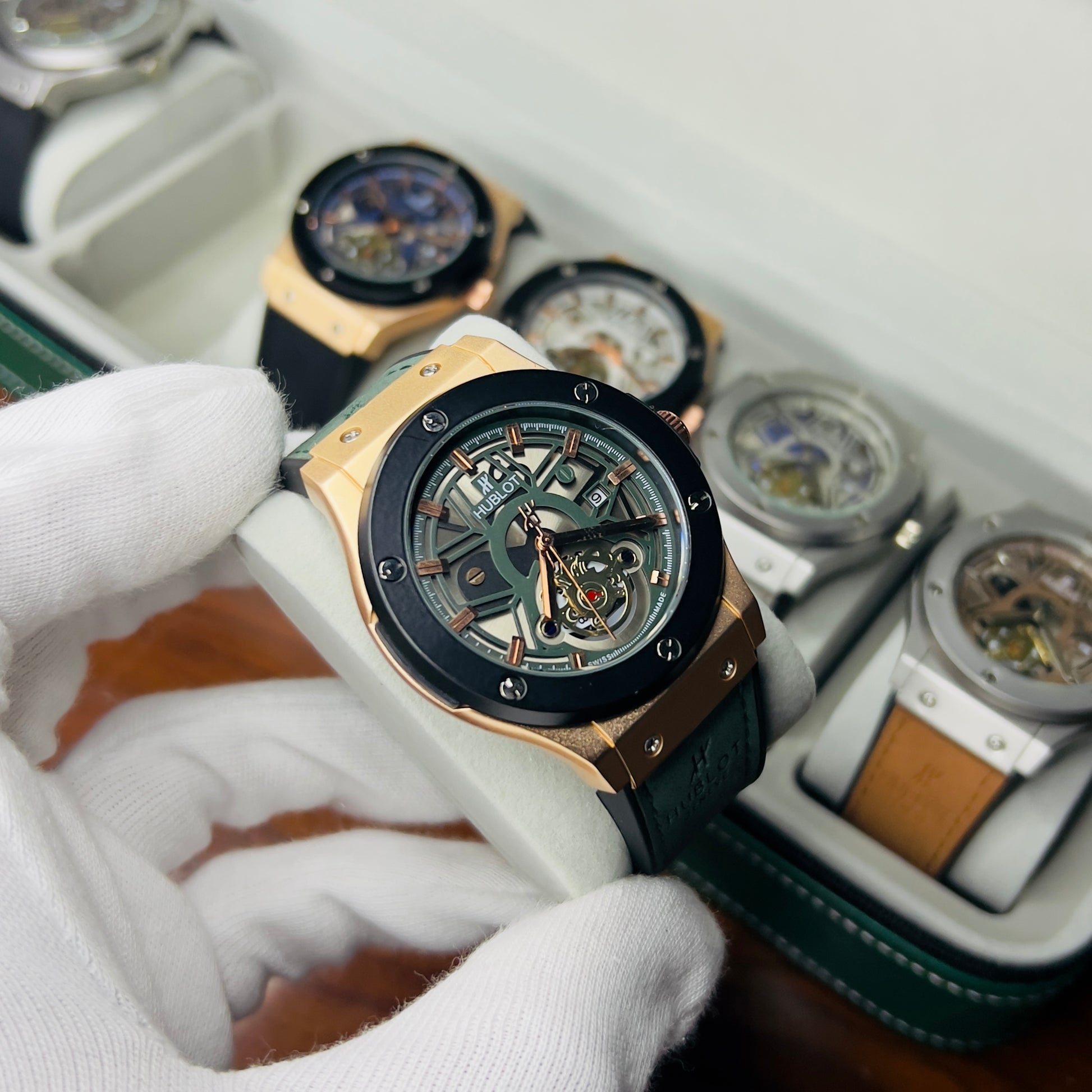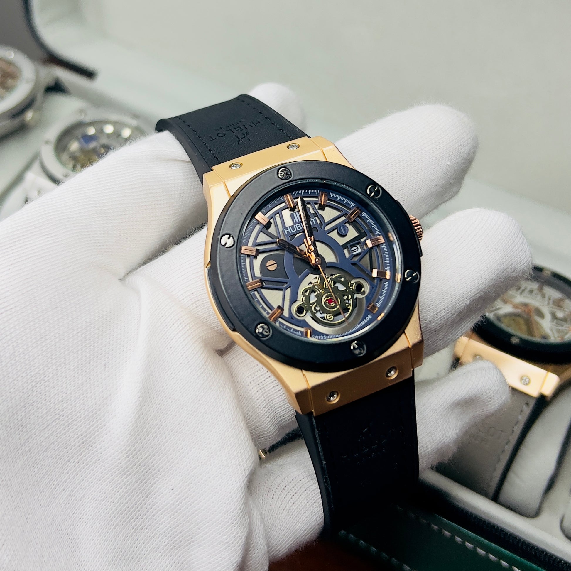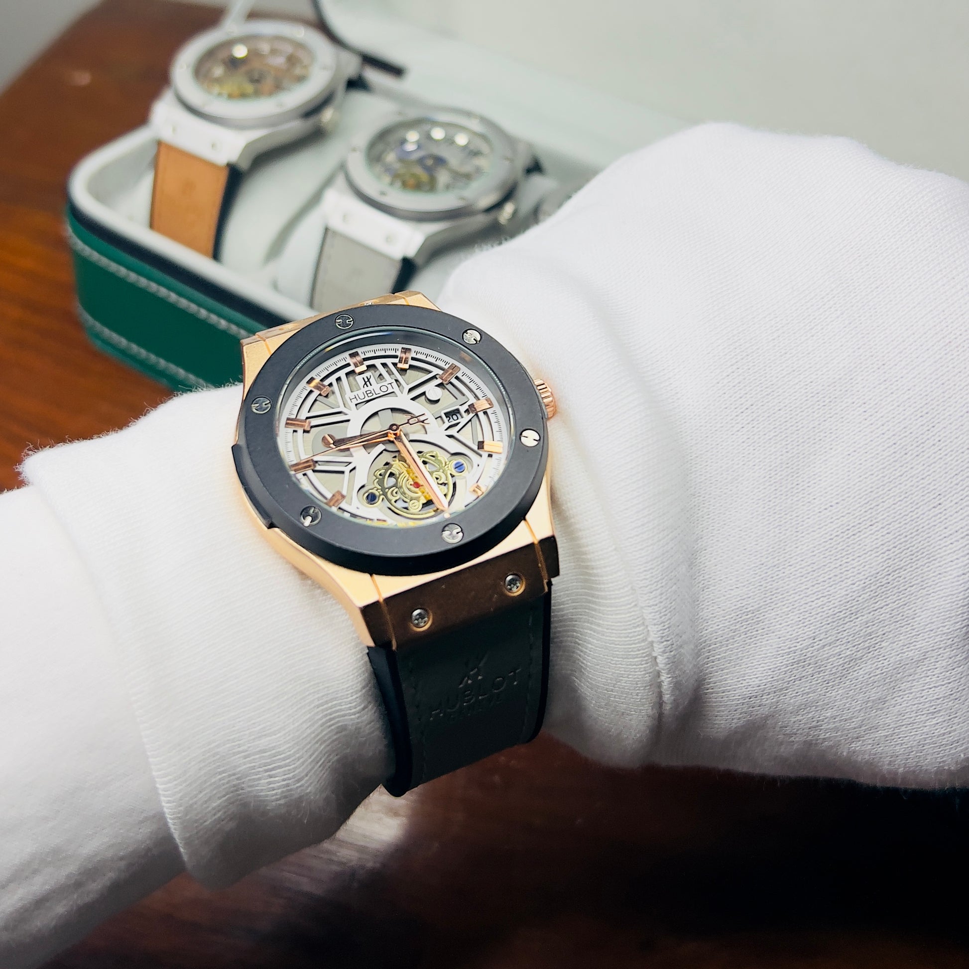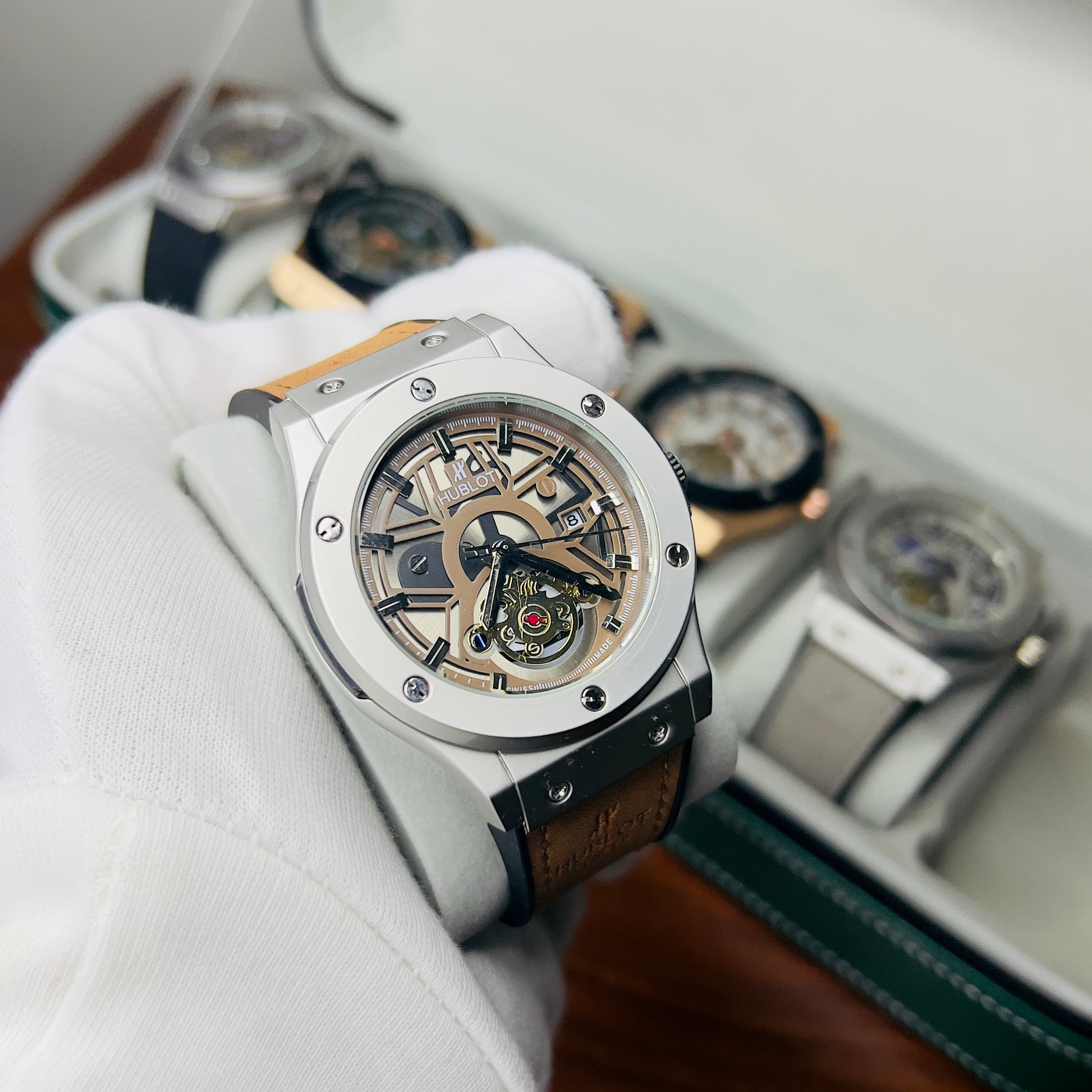Expertly crafted for precision and durability, the HUBLOT GENEVA boasts a date function and water-resistant design. The lather_urbber strip and steel lock provide comfort and security, while the steel case comes in a variety of stylish colors. Choose from green, brown, silver, or classic black to complement your unique style.