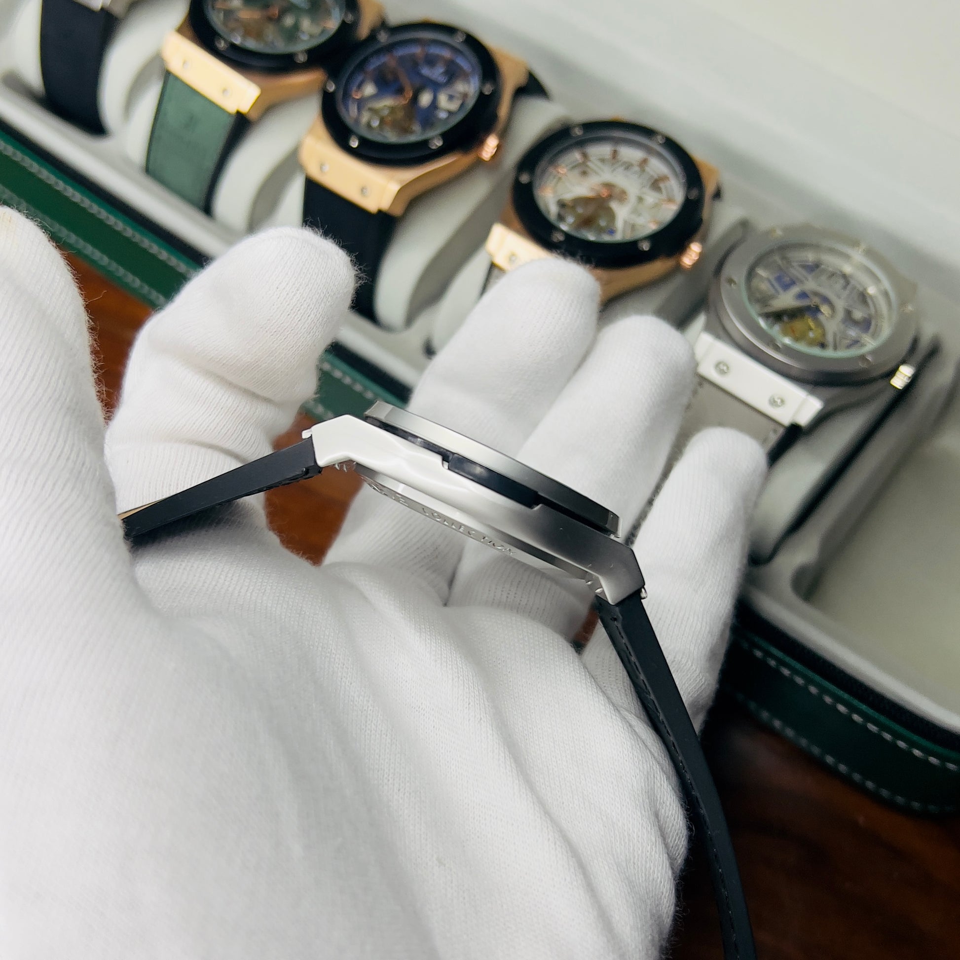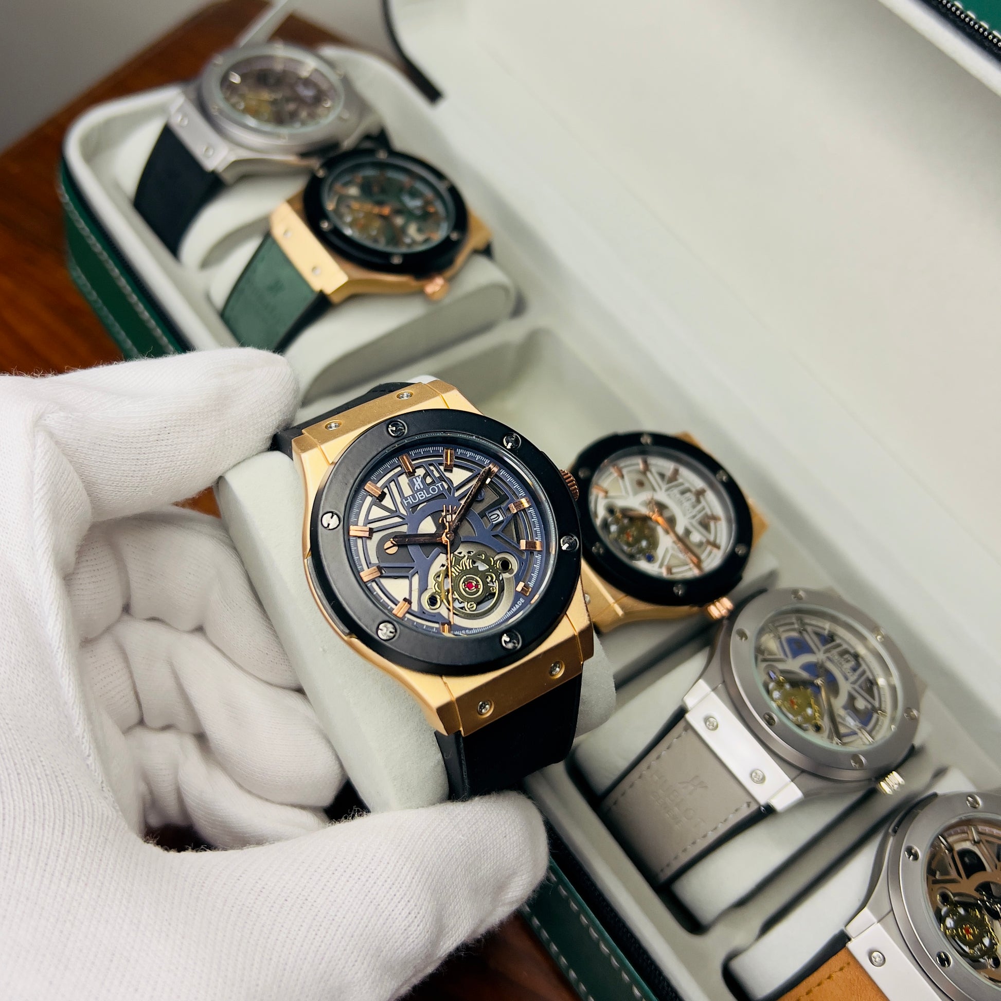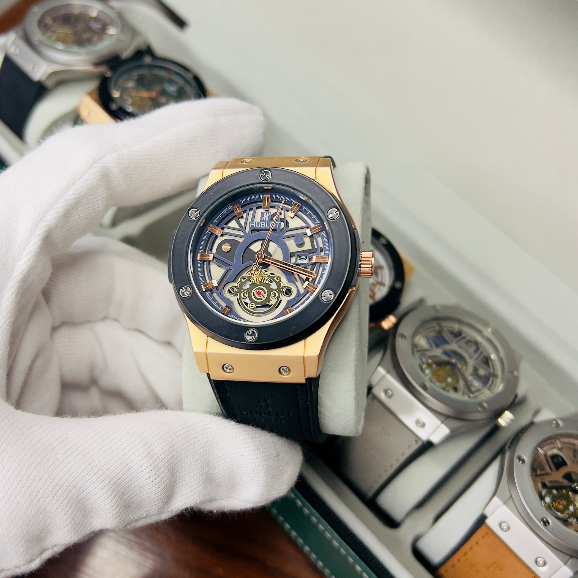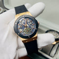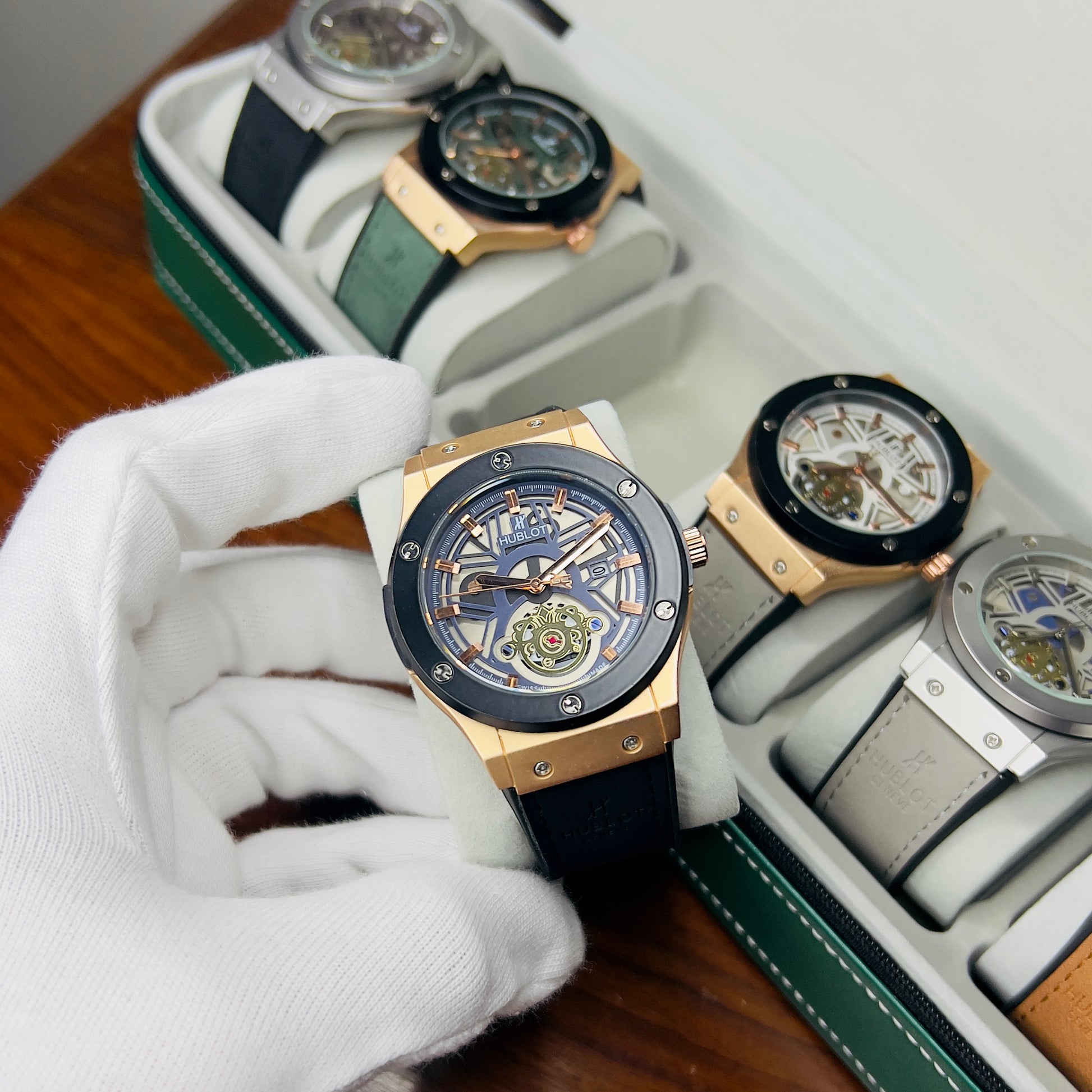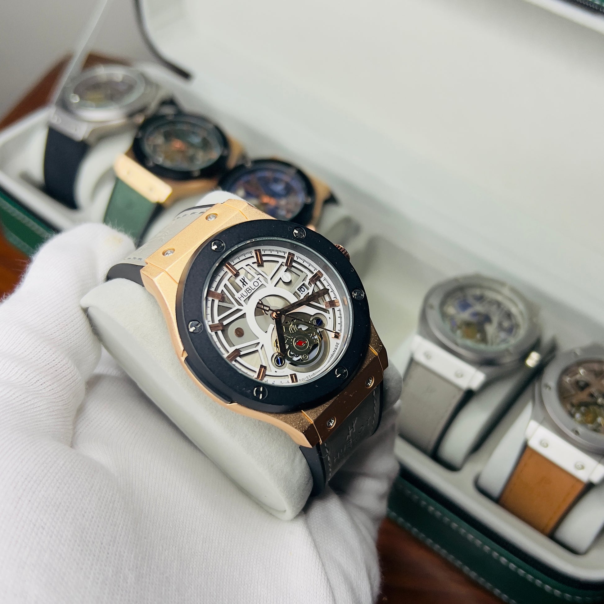 Expertly crafted for precision and durability, the HUBLOT GENEVA boasts a date function and water-resistant design. The lather_urbber strip and steel lock provide comfort and security, while the steel case comes in a variety of stylish colors. Choose from green, brown, silver, or classic black to complement your unique style.